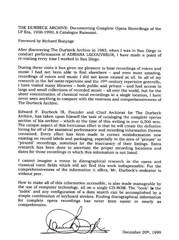 This is the foreword written by Richard Bonynge for The Durbeck Archive Datalogue® The original copy of this document and the accompanying personal letter of dedication are both on file in the offices of The Durbeck Archive.