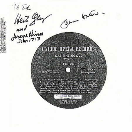 This is a list of all the complete (or abridged) recordings of DAS RHEINGOLD in THE DURBECK ARCHIVE. All opera entries in THE DURBECK ARCHIVE are fully documented, as shown immediately below. Following this fully documented entry is a listing of all of the other complete recordings of DAS RHEINGOLD in THE DURBECK ARCHIVE. These listings are in an abbreviated form, listed in the chronological order of their recording dates.